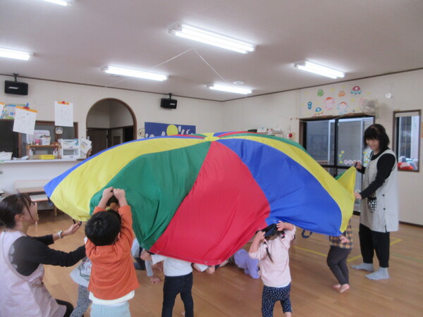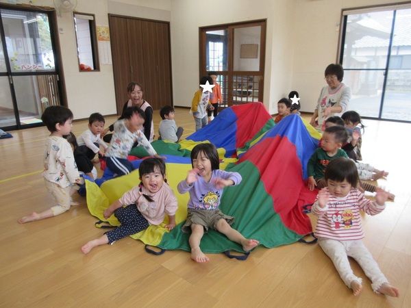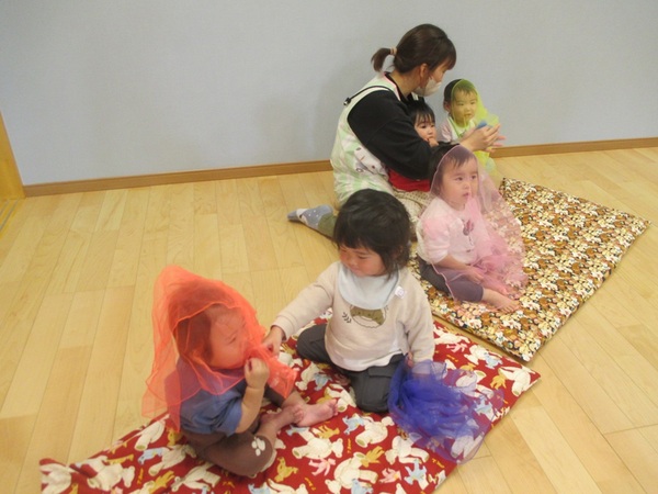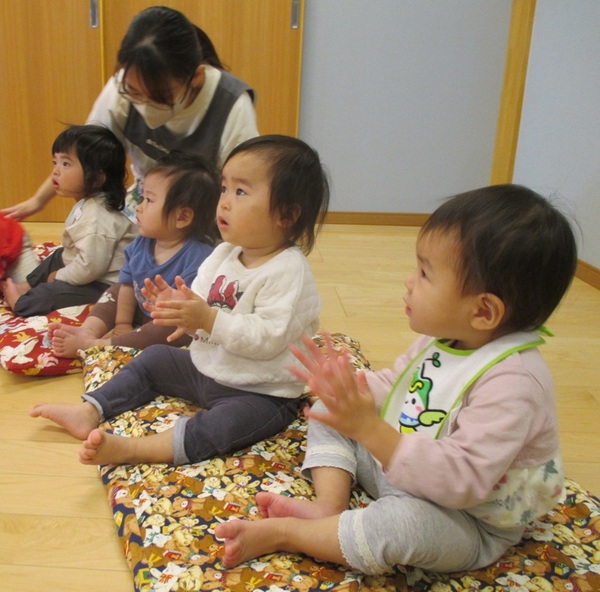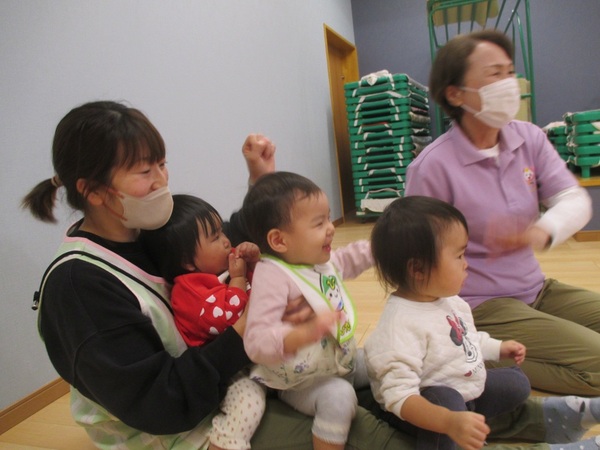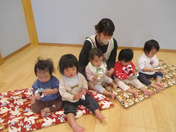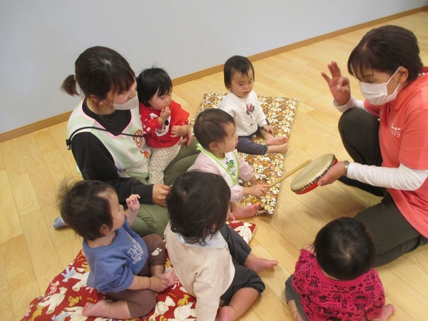 音楽に合わせて体を揺らしたり、太鼓や鈴で楽しく遊びました!