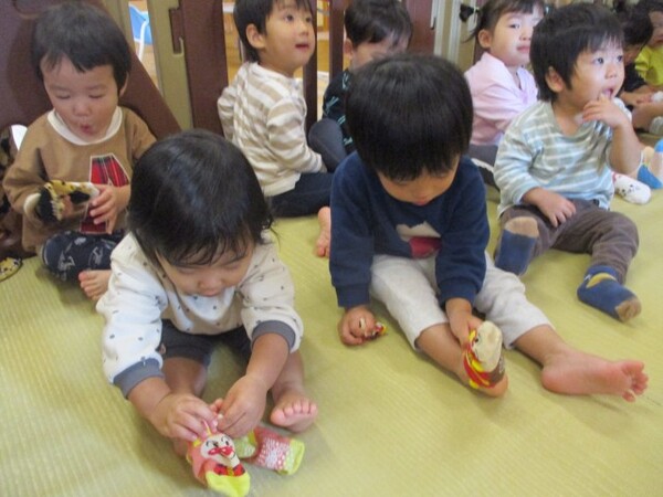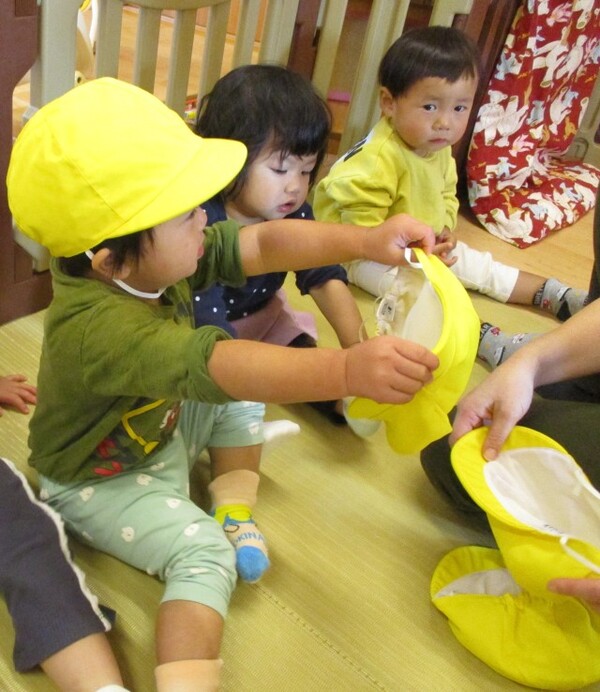 子ども達、一所懸命自分で靴下を履こうとしたり帽子をかぶったり頑張っています!