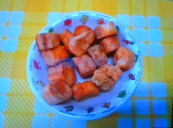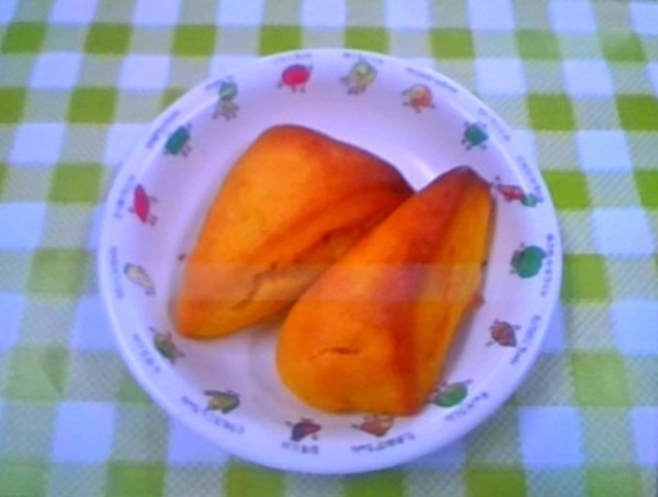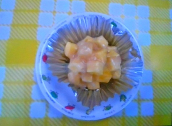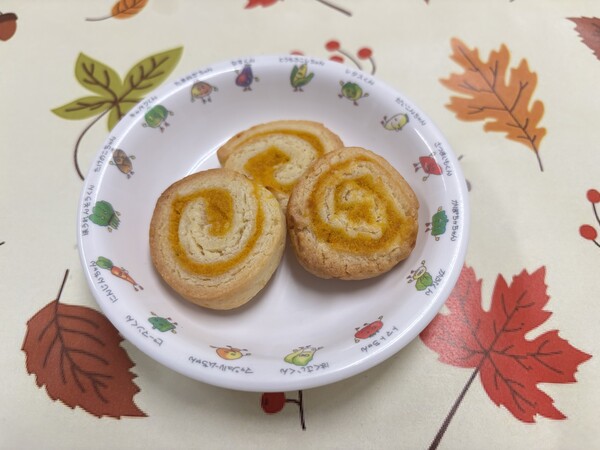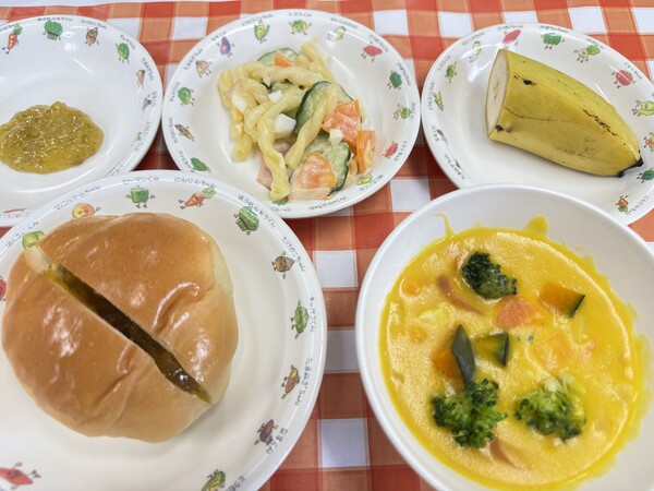 今日のパンのお供は「梅ジャム」。園でとれた梅で作った梅シロップの梅を利用して作りました。かぼちゃのこっくりした味わいのシチューもよく食べていました。
