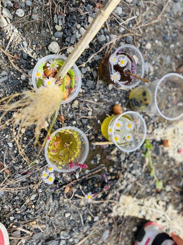 秋の実を拾ってお散歩先で色水遊び!色の変化を楽しみながら、デコレーションしたりしてジュース屋さんごっこなどして遊びました!