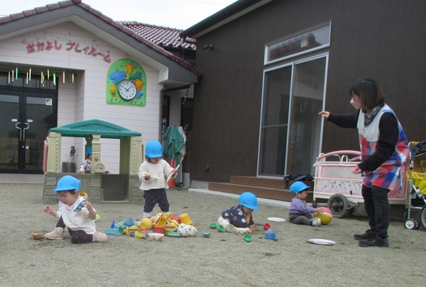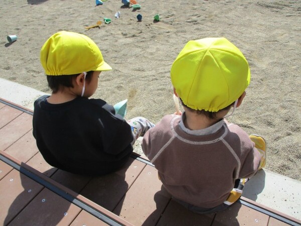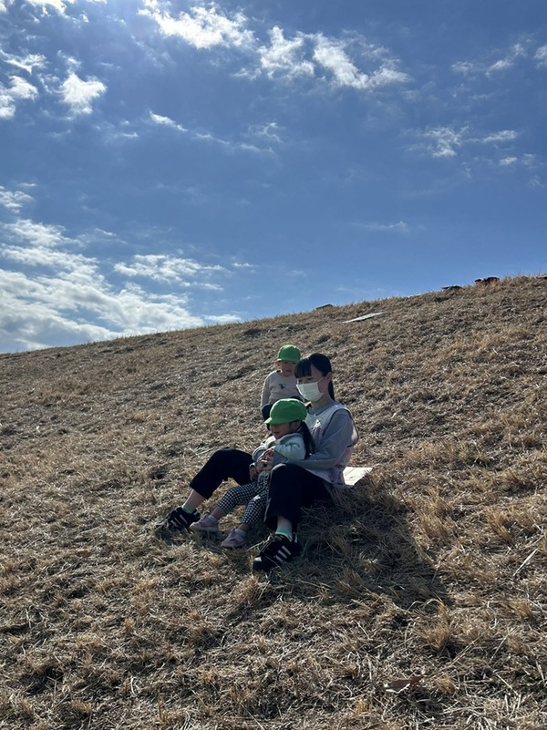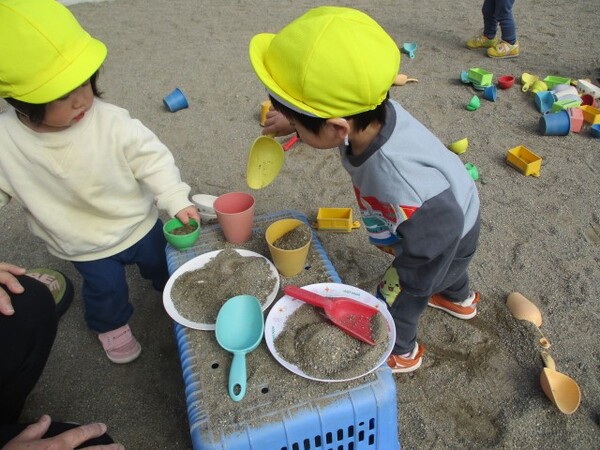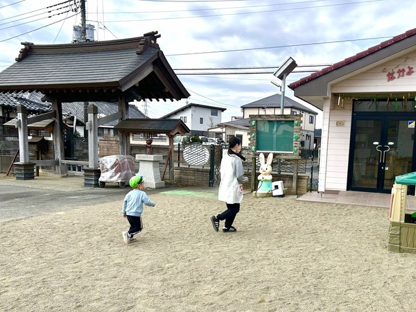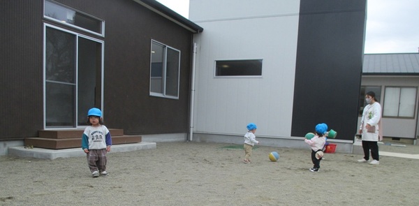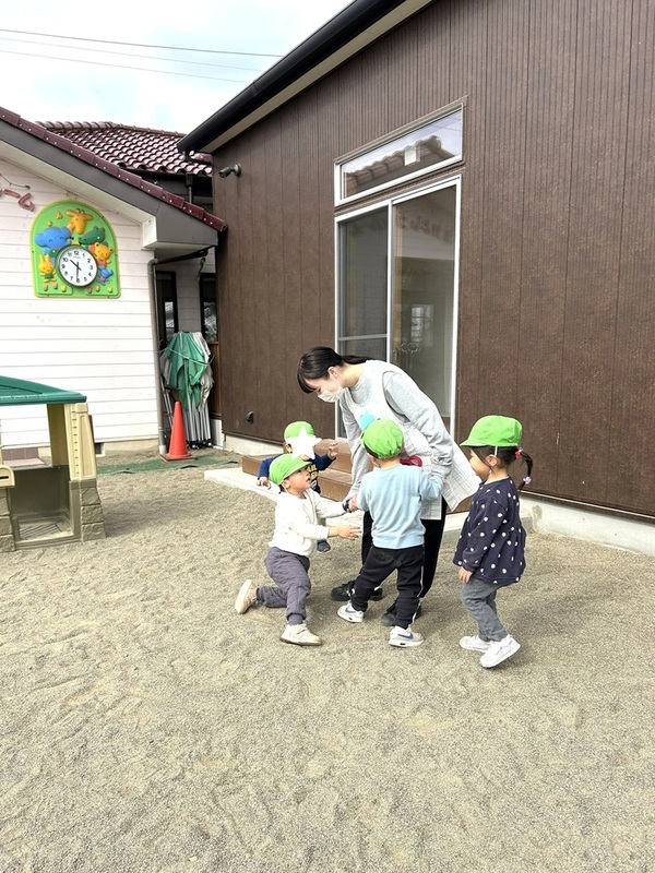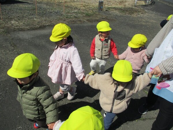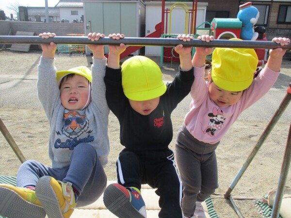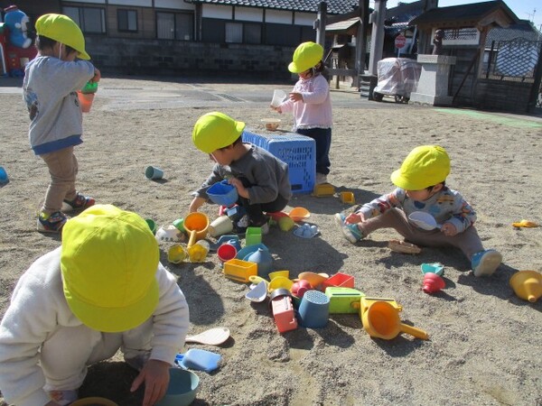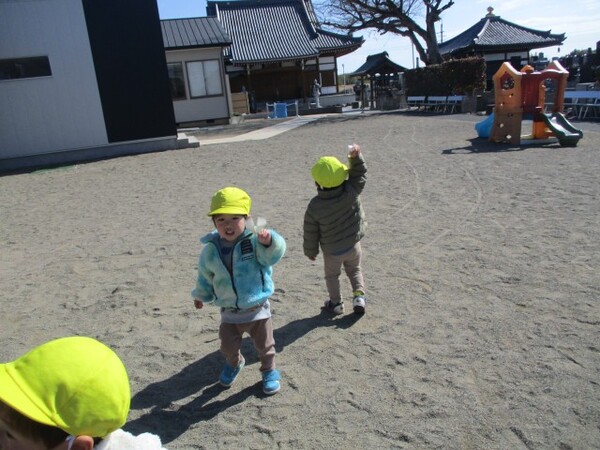 園庭で好きな遊びを見つけ、のびのびと遊ぶ子どもたち。少しずつ春の風を感じられるようになりお外に出るのが楽しみですね。