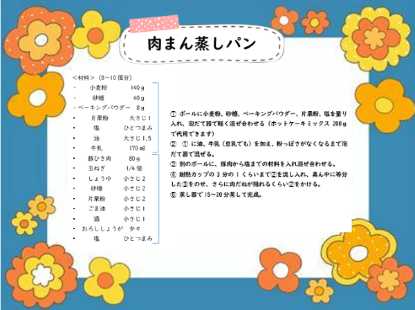 今日のおやつは「肉まん蒸しパン」。生地で包まず作れるので普通の肉まんよりもお手軽に作れます。今回は肉だねを入れましたが、こしあんやキーマカレーを入れても美味しく作れそうです。レシピも掲載したのでぜひお試しください。