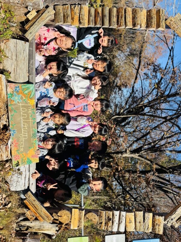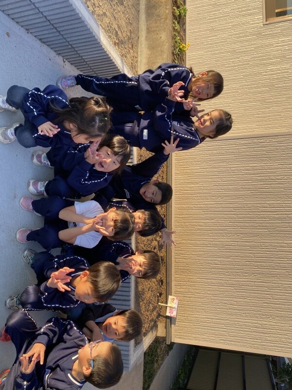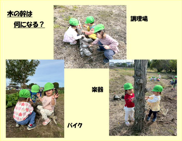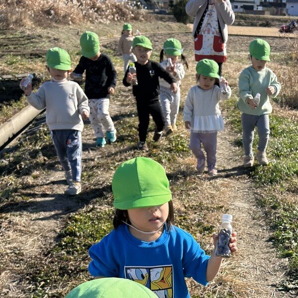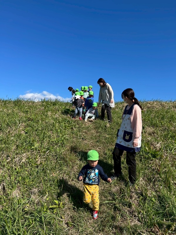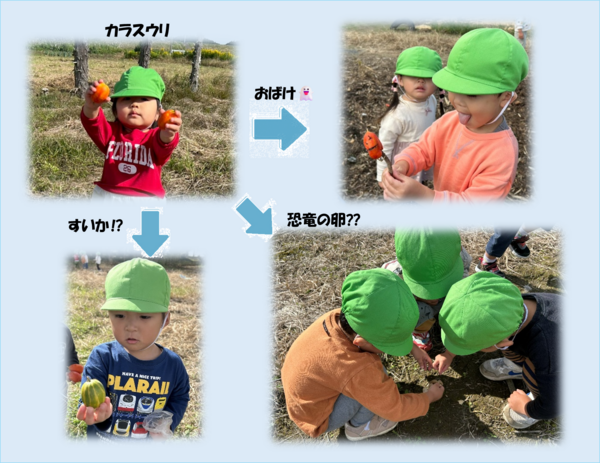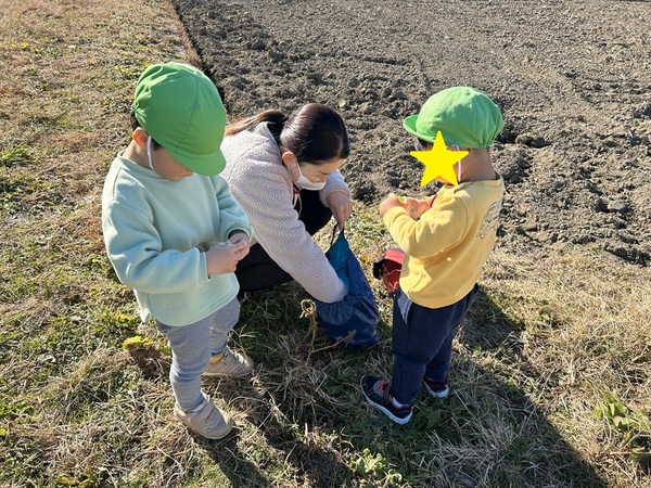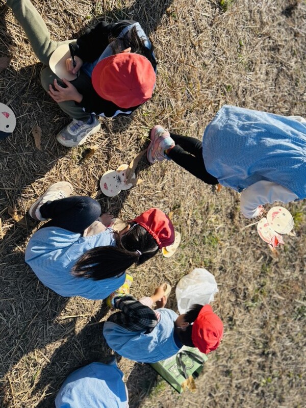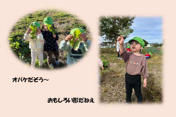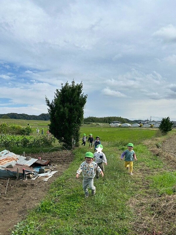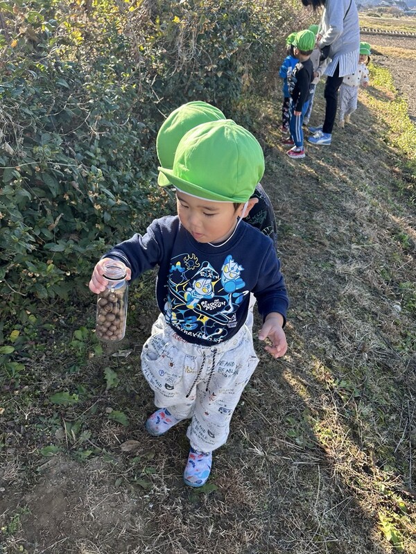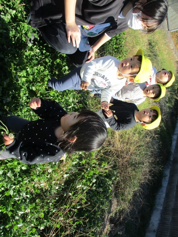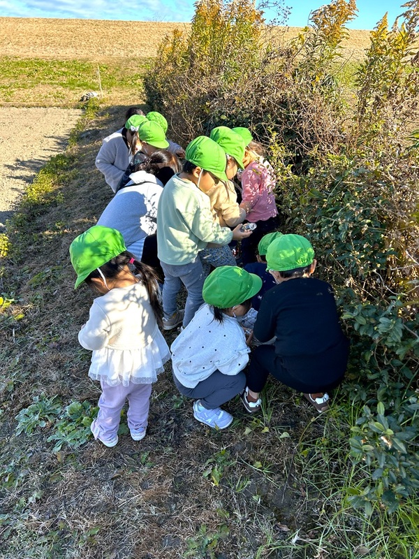 秋空の下、葉っぱや木の実で遊んでいます。体の使い方が上手になってきて、足場の不安定な畦道や土手も上手に行き来できるようになってきている子どもたちです!