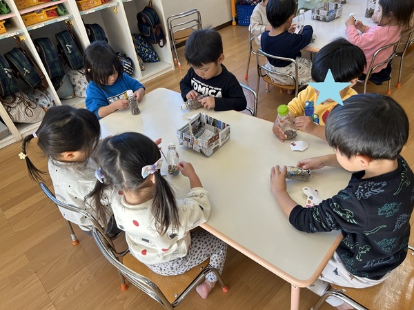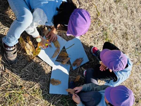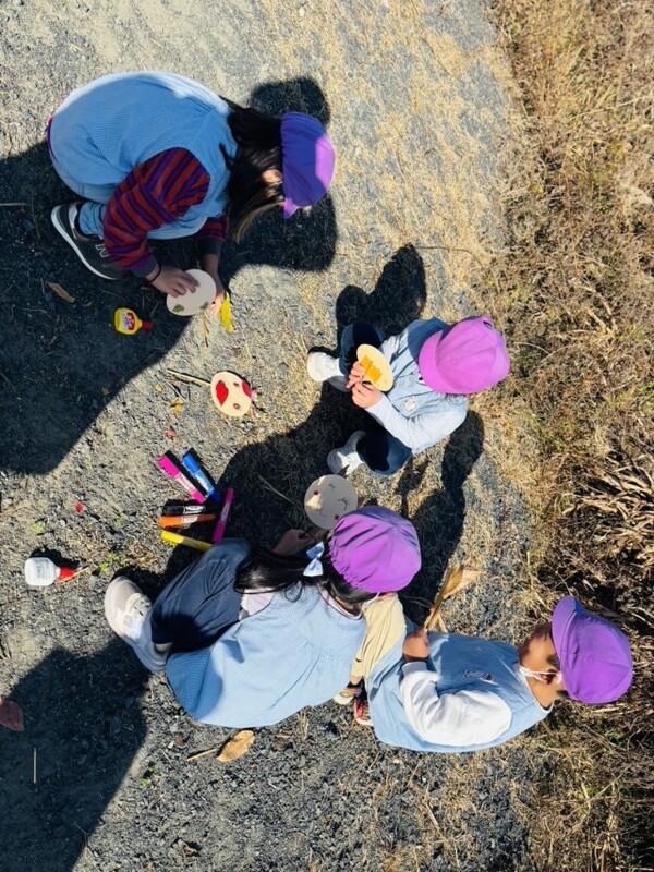 子どもたちが拾った落ち葉やどんぐりを使って、この時期にしかできない自然物遊びをしてきました!