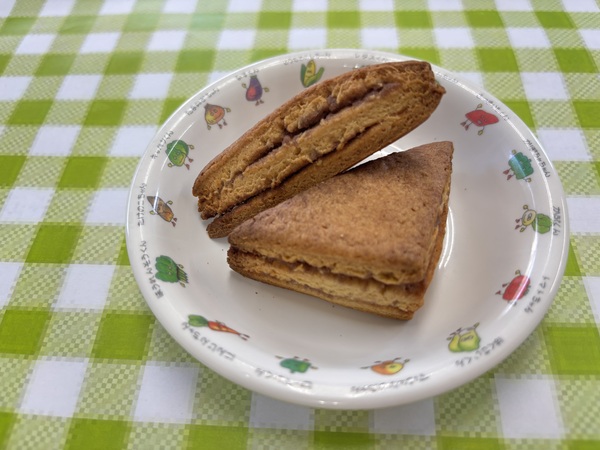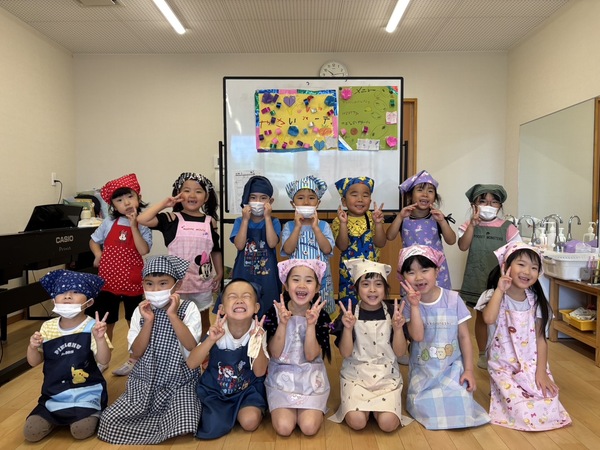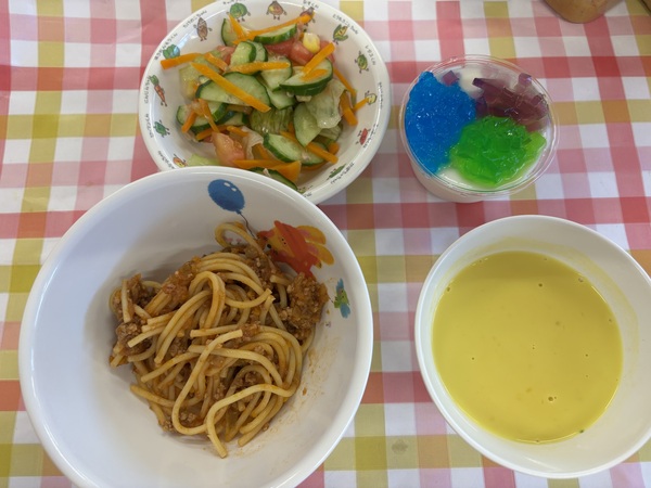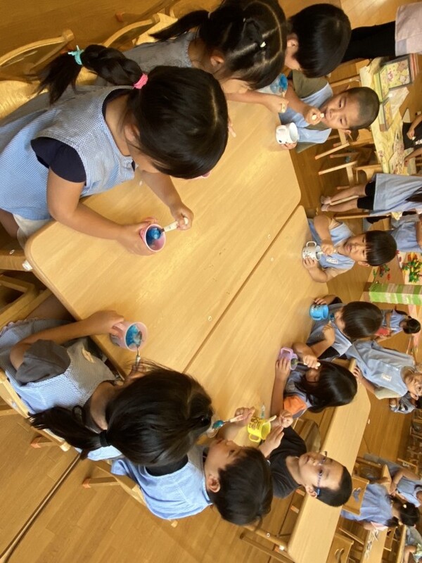 今日はさくら組のみんなと一緒に作りました。デザートはカルピスゼリーにかき氷のシロップで作ったクラッシュゼリーを自分好みにトッピング!楽しい給食の時間を過ごす事が出来ました。おやつはこしあんを折り込んだスコーンです。